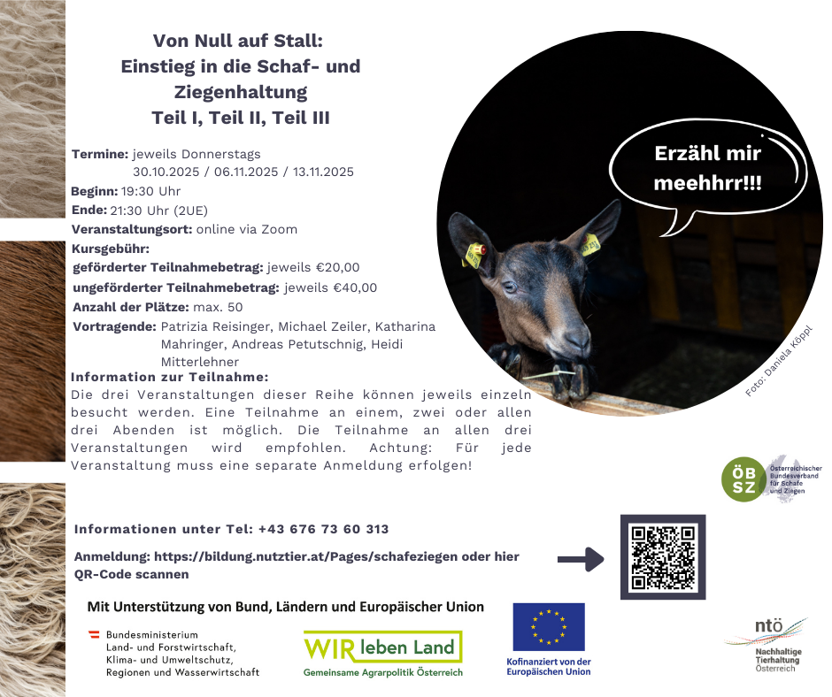 Nähere Informationen zur Veranstaltung und Anmeldung finden Sie unter: https://bildung.nutztier.at/Pages/schafeziegen